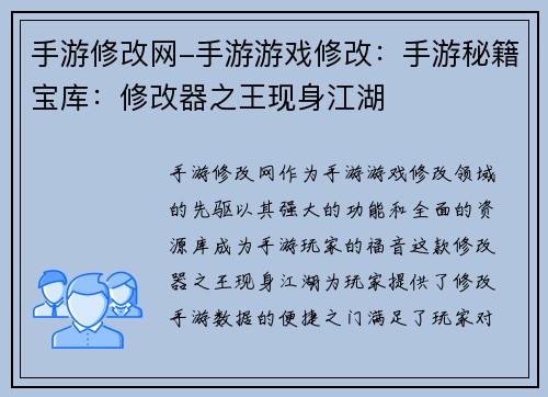 手游修改网-手游游戏修改:手游秘籍宝库:修改器之王现身江湖是一款集覆盖面广、功能强大、操作简单、安全稳定和社区活跃于一体的手游修改平台。它为手游玩家提供了便捷途径,让玩家尽享修改带来的乐趣,体验前所未有的游戏快感。