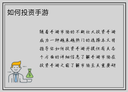 随着手游市场的不断壮大,投资手游成为一种越来越热门的选择。本文将指导你如何投资手游,并提供有关各个方面的详细信息。